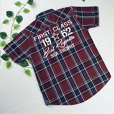 The shirt features a classic checkered pattern in shades of blue and white, with short sleeves and a button-down front for a timeless casual look. The standout detail is the bold graphic print on the back with text and star accents, giving it a trendy, modern twist that kids will love.