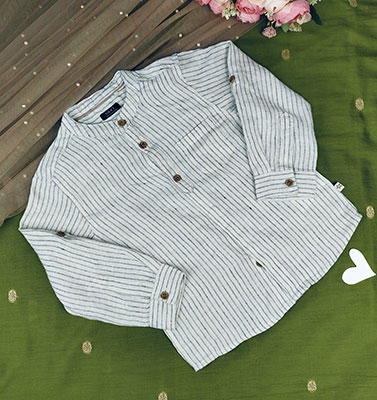 Designed with a classic mandarin collar and wooden button placket, it features vertical stripes for a timeless appeal. The shirt also comes with a chest pocket for added style and functionality, while the roll-up sleeves with button tabs make it versatile for both casual and semi-formal occasions.