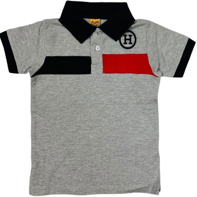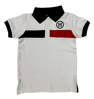 The shirt features a classic polo collar with button closure, short sleeves with contrast white cuffs, and a stylish color-block design in black, white, and red. The embroidered “H” chest logo adds a trendy, sporty touch, making it perfect for both casual outings and semi-formal occasions.
