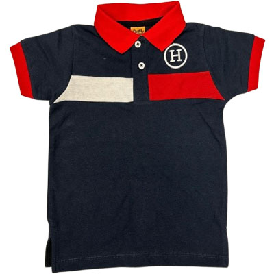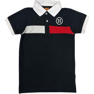polo t-shirt with short sleeves, buttoned collar, color block design, and an "H" chest logo for a stylish casual look.
